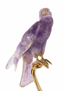 A FINE & RARE YELLOW METAL & DIAMOND SET OBJET D'ART MODEL OF A FALCON ON PERCHCIRCA 1980sCarved amethyst Falcon with diamond set eyes & beak, perched on a yellow metal base opposite carved rose quartz flowers set with diamonds.Measures approx. 16" in height & approx. 22" end to end.Item is in excellent condition.