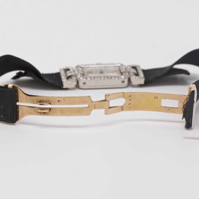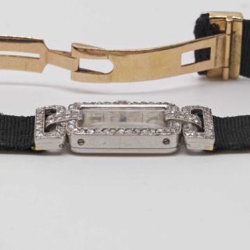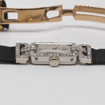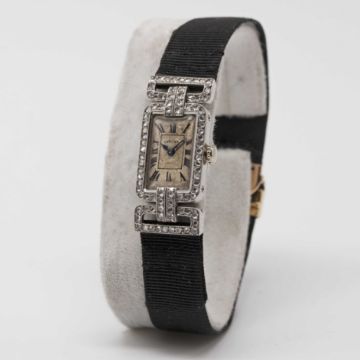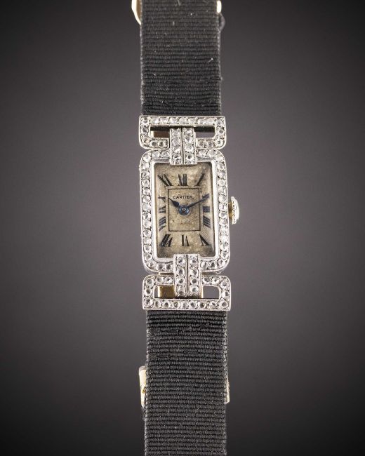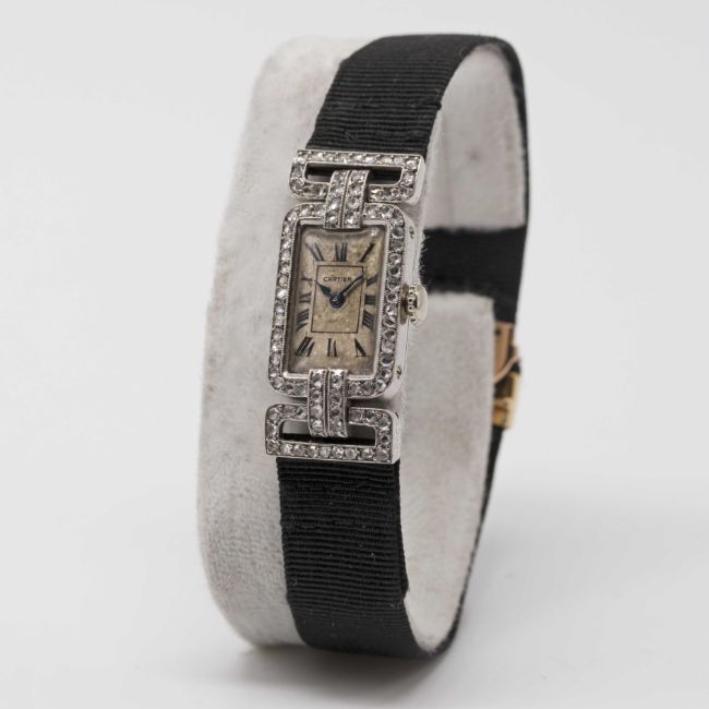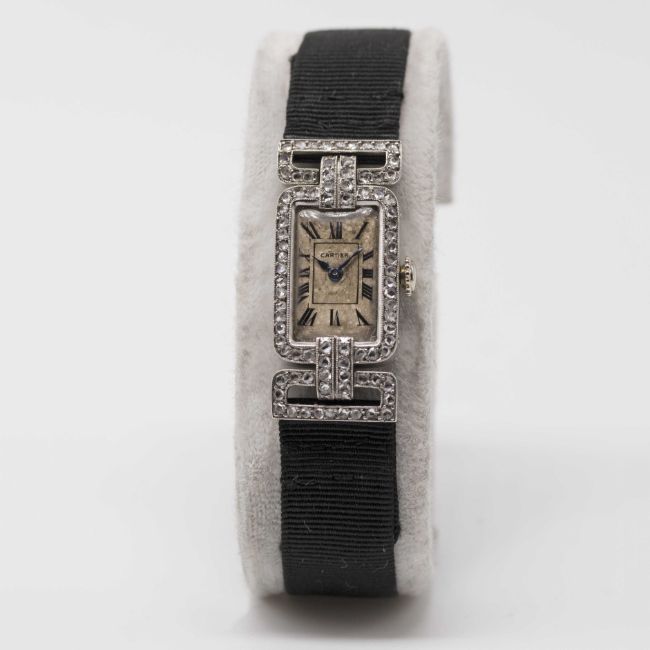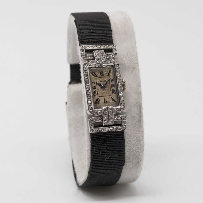 A RARE LADIES PLATINUM & DIAMOND CARTIER COCKTAIL WATCHCIRCA 1920sMovement: 19J, manual wind, signed European Watch & Clock Co. Inc.Case: Approx. 30.5mm (inc. lugs) by 13.5mm, original diamond set case & swivel lugs, platinum hallmarks, numbered 13xxx & 24xxx to outside case back, numbered 13xxx to inside matching outside, numbered 011xx to side of lug.Strap: Textile strap with original 18k solid gold & platinum deployment clasp, numbered 54xx.CONDITION REPORTDial: Dial in fair condition.Movement: Running & functioning at present, timekeeping and accuracy cannot be guaranteed.Case: In good condition, with small scratches due to general use.Strap/Bracelet: In very good condition.