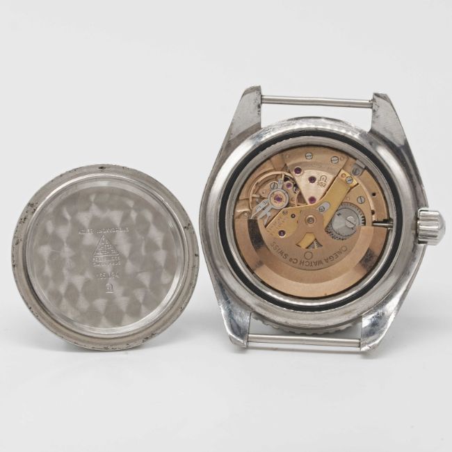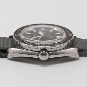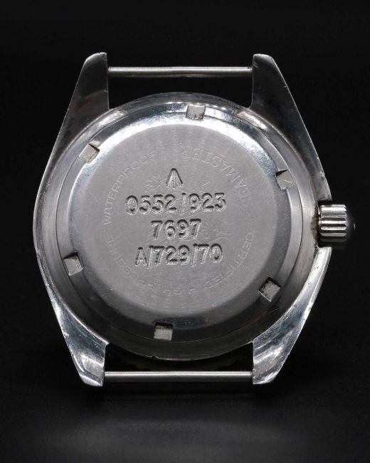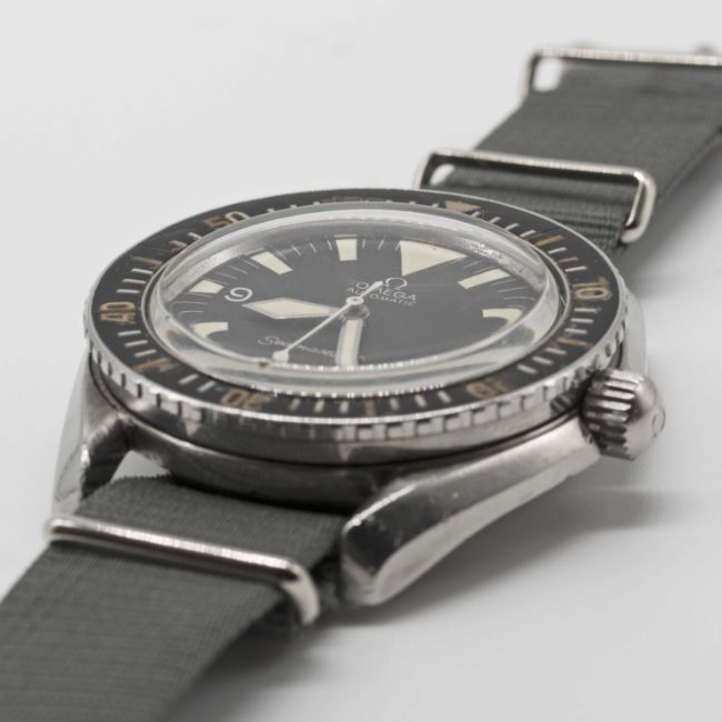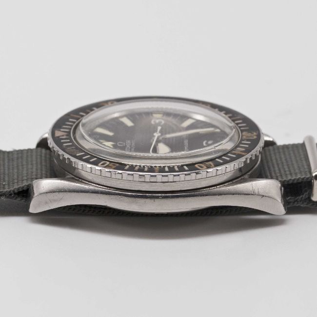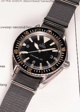 A RARE GENTLEMAN'S STAINLESS STEEL BRITISH MILITARY OMEGA SEAMASTER 300 "BIG TRIANGLE" ROYAL NAVY DIVERS AUTOMATIC WRIST WATCHDATED 1968, REF. 165.024 CB WITH OMEGA EXTRACT OF THE ARCHIVES SHOWING DELIVERY TO THE ROYAL NAVYMovement: 24J, automatic, cal. 552, signed Omega Watch Co., numbered 26,xxx,xxx.Case: Diameter approx. 42mm, fixed bars, screw back, signed Omega Watch Co, issue markings ^ 0552/923 7697 A/729/70, 60 minute rotating bakelite bezel, Omega screw-down crown.Strap: NATO.CONDITION REPORTDial: Original dial in excellent condition.Movement: Running & functioning at present, timekeeping and accuracy cannot be guaranteed.Case: In fair condition, with scratches due to use, ageing & wear to bezel.Strap/Bracelet: In excellent condition.