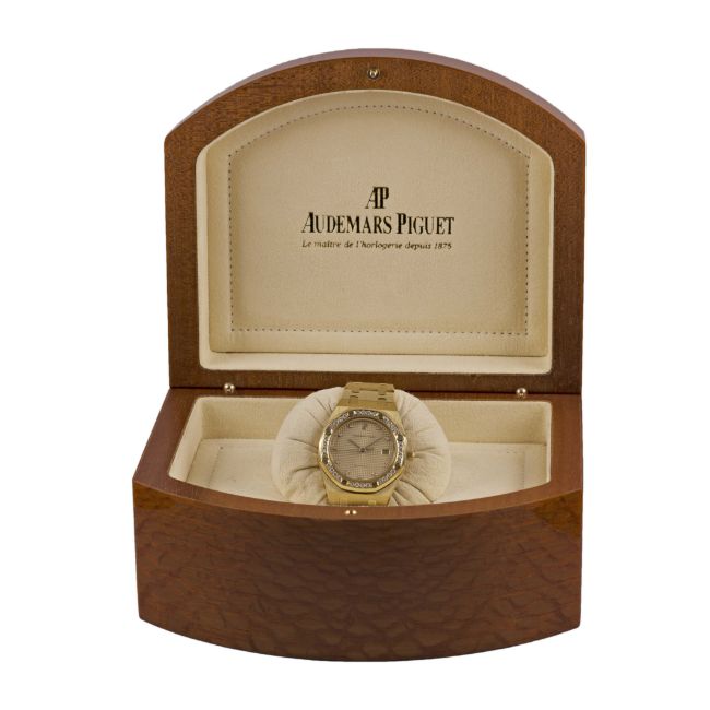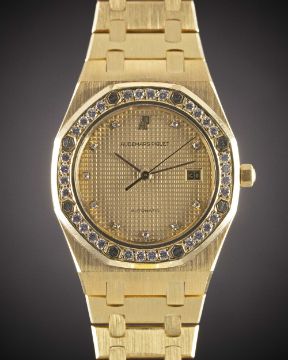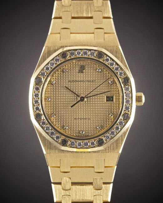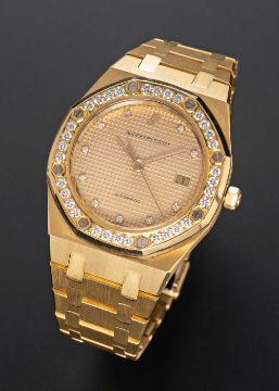 A FINE GENTLEMAN'S SIZE 18K SOLID YELLOW GOLD & DIAMOND AUDEMARS PIGUET ROYAL OAK AUTOMATIC BRACELET WATCHCIRCA 1980s, REF. 4100BA WITH ORIGINAL DIAMOND SET BEZEL & CHAMPAGNE TAPISSERIE DIAL, ACCOMPANIED BY AP BOXMovement: Automatic, signed Audemars Piguet, numbered.Case: Width approx. 35mm, original diamond set bezel, signed Royal Oak, numbered 44x, 18k hallmarks, AP screw-down crown.Bracelet: Original 18k solid gold AP Royal Oak bracelet with flip-lock clasp.CONDITION REPORTDial: Original dial in excellent condition.Movement: Running & functioning at present, timekeeping and accuracy cannot be guaranteed.Case: In excellent condition.Strap/Bracelet: In excellent condition.