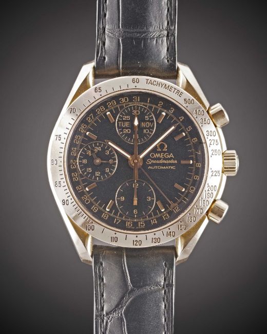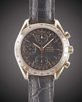 A GENTLEMAN'S 18K SOLID ROSE GOLD OMEGA SPEEDMASTER TRIPLE CALENDAR AUTOMATIC CHRONOGRAPH WRIST WATCHCIRCA 2000, REF. 175.0084 WITH BLACK DIAL, ACCOMPANIED BY OMEGA BOXMovement: 25J, automatic, cal. 1151, signed Omega.Case: Diameter approx. 39mm, snap back, Speedmaster emblem embossed on case back, signed Omega Watch Co, numbered 57,xxx,xxx, 18k hallmarks, tachymetre bezel, Omega crown & pushers.Strap: Original Omega leather strap & 18k solid rose gold deployment clasp.CONDITION REPORTDial: Original dial in excellent condition.Movement: Running & functioning at present, timekeeping and accuracy cannot be guaranteed.Case: In excellent condition, with some light scratches due to general use.Strap/Bracelet: In excellent condition.
