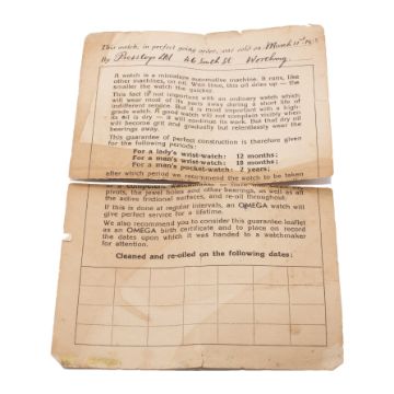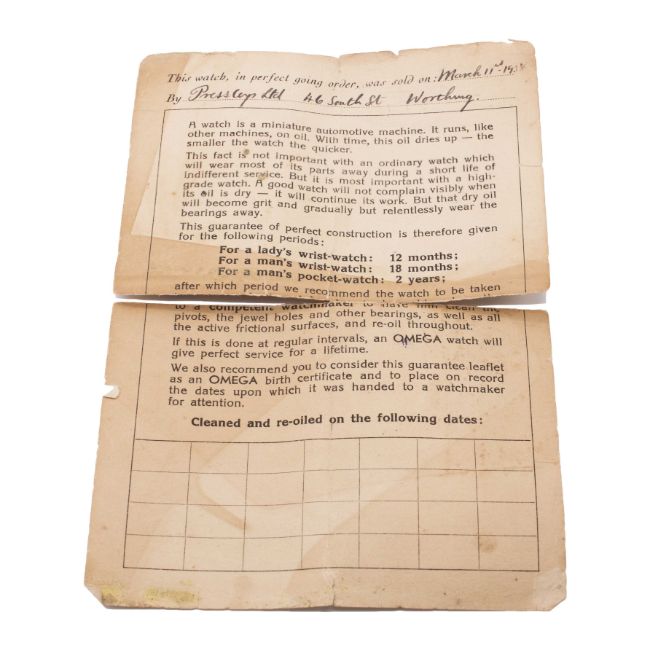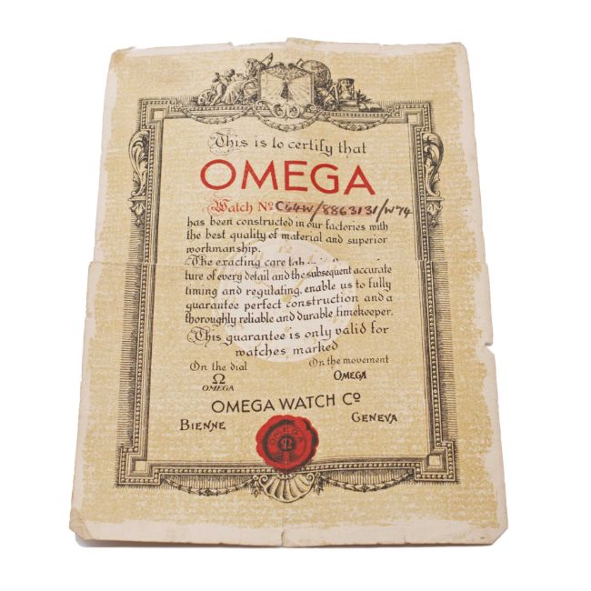 A RARE GENTLEMAN'S STAINLESS STEEL OMEGA "MARINE" WATERPROOF WRIST WATCHDATED 1938, WITH ORIGINAL RETAILER'S BOX & OMEGA GUARANTEE (NUMBERS NOT MATCHING) FROM RETAILERMovement: 15J, manual wind, cal. 19.4T2, signed Omega, numbered 8,3xx,xxx. Case: Width approx. 23mm, two piece "waterproof" case with clip to secure, signed Omega, numbered 8,8xx,xxx, patent numbers.Strap: Leather.CONDITION REPORTDial: Original dial in excellent condition, showing small signs of age.Movement: Running & functioning at present, timekeeping and accuracy cannot be guaranteed.Case: In very good condition, with some small scratches due to general use.Strap/Bracelet: In excellent condition.