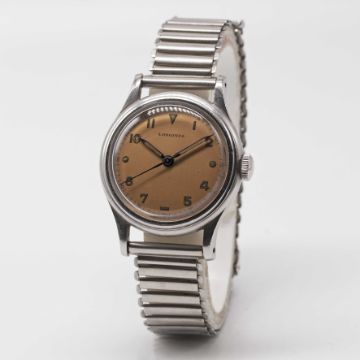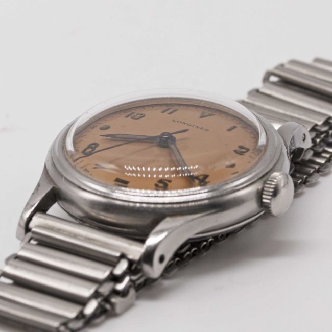 A RARE GENTLEMAN'S STAINLESS STEEL LONGINES "SEI TACCHE" BRACELET WATCHCIRCA 1945, "SALMON" DIAL WITH LUMINOUS MARKERS & NUMERALSMovement: Manual wind, cal. 10.68N, signed Longines, numbered 7,0xx,xxx.Case: Diameter approx. 33mm, screw back with 6 notches, signed Longines, numbered 23,xxx / 15x, lug numbered 15x matching case back. Bracelet: Bonklip.CONDITION REPORTDial: Original dial in very good condition, showing some signs of age.Movement: Running & functioning at present, timekeeping and accuracy cannot be guaranteed.Case: In very good condition, with some small scratches due to general use.Strap/Bracelet: In very good condition.