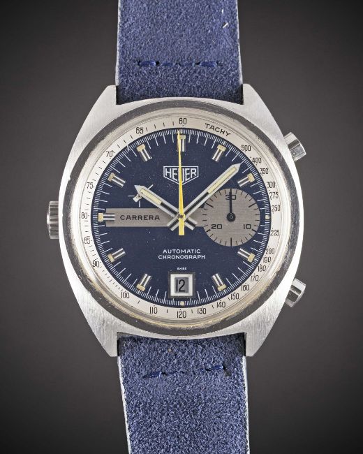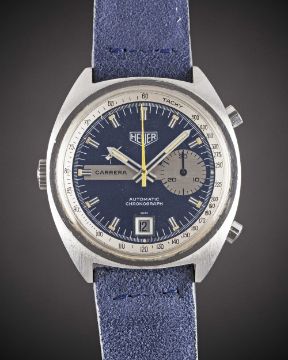 A GENTLEMAN'S STAINLESS STEEL HEUER CARRERA AUTOMATIC CHRONOGRAPH WRIST WATCHCIRCA 1970s, REF. 1553N WITH BRUSHED BLUE DIALMovement: 17J, automatic, cal. 15, signed Heuer.Case: Width approx. 38.5mm, screw back, signed Heuer-Leonidas SA, numbered 25x,xxx, Heuer crown & pushers.Strap: Suede.CONDITION REPORTDial: Original dial in very good condition, showing small signs of age.Movement: Running & functioning at present, timekeeping and accuracy cannot be guaranteed.Case: In very good condition, with some small scratches due to general use.Strap/Bracelet: In excellent condition.