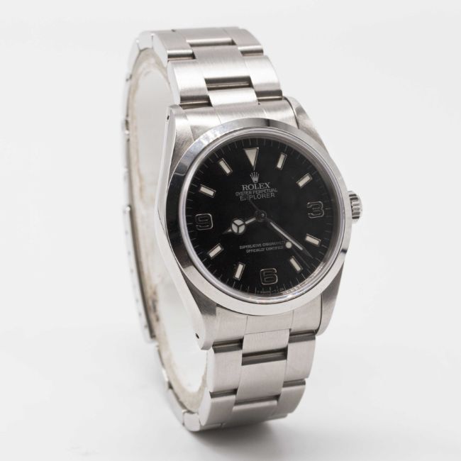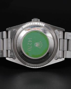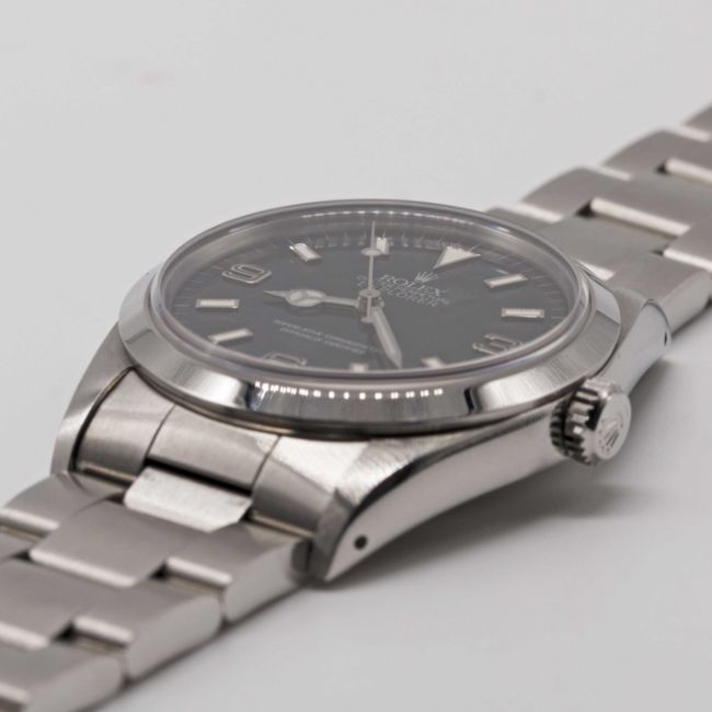 A RARE GENTLEMAN'S STAINLESS STEEL ROLEX OYSTER PERPETUAL EXPLORER "BLACK OUT" BRACELET WATCHDATED 1991, REF. 14270 WITH ORIGINAL GUARANTEE, ROLEX BOX, BOOKLETS & ROLEX SERVICE PAPERWORK FROM 2010, ORIGINAL CASE BACK STICKER STILL APPLIEDMovement: 27J, automatic chronometer, cal. 3000, signed Montres Rolex S.A., numbered.Case: Diameter approx. 36mm, Oyster case, signed Montres Rolex S.A., E serial no., sapphire crystal, Rolex crown.Bracelet: Original Rolex Oyster bracelet, numbered P6/78360/558B.CONDITION REPORTDial: Original dial in excellent condition.Movement: Running & functioning at present, timekeeping and accuracy cannot be guaranteed.Case: In excellent condition, with some light scratches due to occasional use.Strap/Bracelet: In excellent condition, with some light scratches due to occasional use.