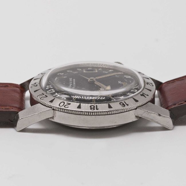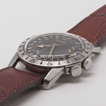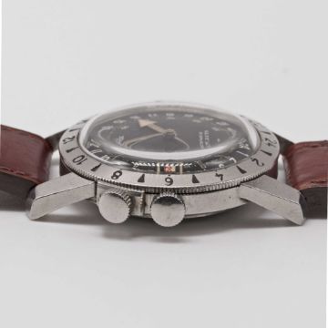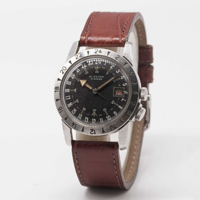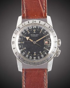 A GENTLEMAN'S STAINLESS STEEL GLYCINE AIRMAN PILOTS WRIST WATCHCIRCA 1955Movement: 23J, automatic, Felsa cal. 692N, signed Glycine Watch Co Airman.Case: Diameter approx. 36mm, screw back, signed Glycine, numbered A 42xxx, patent number +314 050+, 24 hour rotating bezel for second time zone which can be locked by secondary crown.Strap: Leather.CONDITION REPORTDial: Original dial in very good condition, showing some small signs of age.Movement: Running & functioning at present, timekeeping and accuracy cannot be guaranteed.Case: In very good condition, with some scratches due to general use.Strap/Bracelet: In excellent condition.