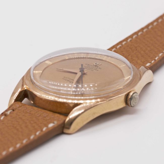 A GENTLEMAN'S 18K SOLID ROSE GOLD UNIVERSAL GENEVE POLEROUTER DE LUXE WRIST WATCHCIRCA 1950s, REF. 10357 1Movement: 28J, automatic Microtor (marked "Patented Rights Pending" under rotor), cal. 215, signed Universal Geneve.Case: Diameter approx. 34mm, screw back, signed Universal Geneve, 18k hallmarks, numbered 1,9xx,xxx, Universal crown.Strap: Leather.CONDITION REPORTDial: Original dial in very good condition, showing some small signs of age.Movement: Running & functioning at present, timekeeping and accuracy cannot be guaranteed.Case: In very good condition, with some small scratches due to general use, some wear to crown.Strap/Bracelet: In excellent condition.