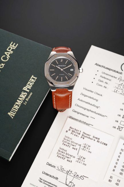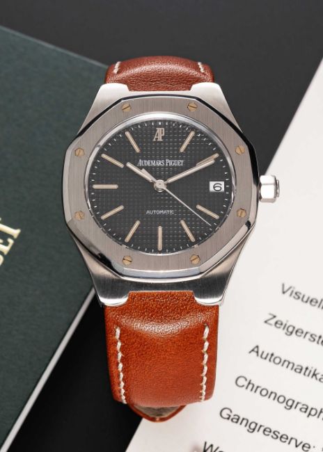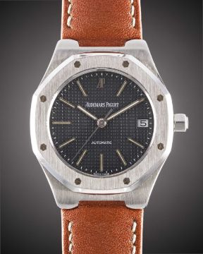 A GENTLEMAN'S STAINLESS STEEL AUDEMARS PIGUET ROYAL OAK AUTOMATIC WRIST WATCHCIRCA 2000, REF. 14800ST WITH GREY TAPISSERIE DIAL, ACCOMPANIED BY AUDEMARS PIGUET SERVICE PAPERWORK FROM 2015Movement: Automatic, signed Audemars Piguet. Case: Width approx. 36mm, signed Royal Oak, numbered 177 / D18xxx, AP screw-down crown.Strap: AP leather strap & deployment clasp.CONDITION REPORTDial: Original dial in excellent condition.Movement: Running & functioning at present, timekeeping and accuracy cannot be guaranteed.Case: In excellent condition, with some light scratches due to general use.Strap/Bracelet: In excellent condition.
