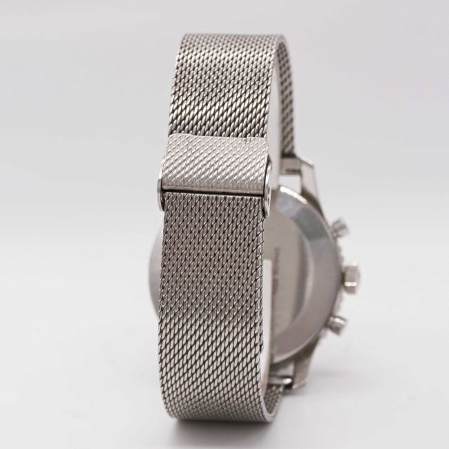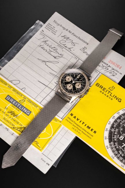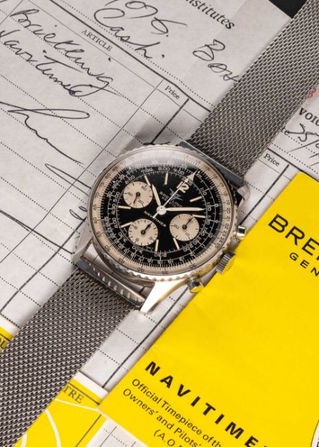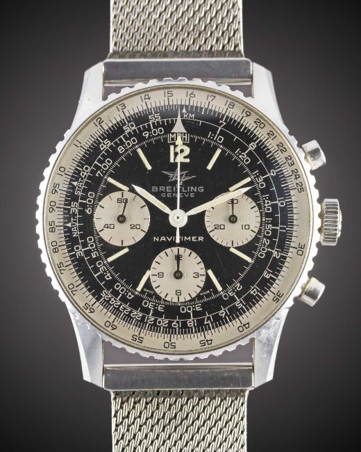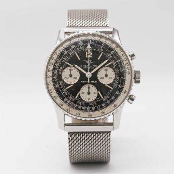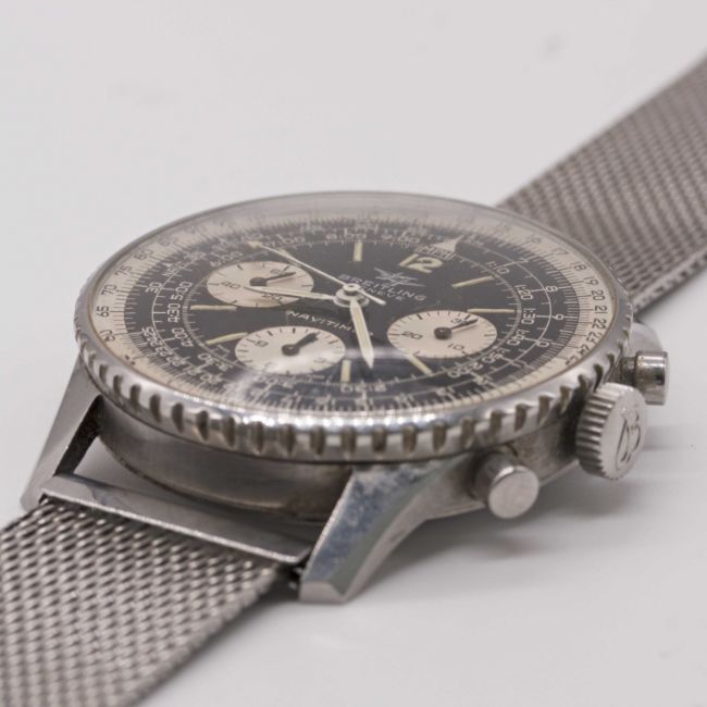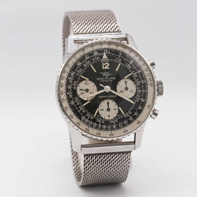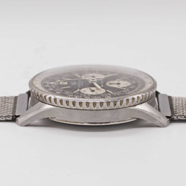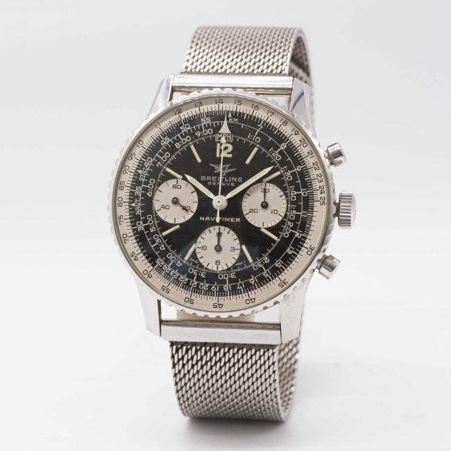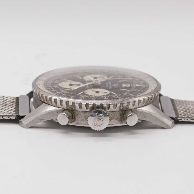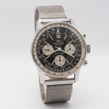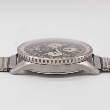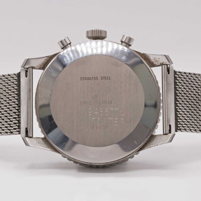 A RARE GENTLEMAN'S STAINLESS STEEL BREITLING NAVITIMER CHRONOGRAPH BRACELET WATCHDATED 1967, REF. 806 PURCHASED FROM THE NAAFI (BRITISH MILITARY SUPPLIERS) IN BAHRAIN, WITH ORIGINAL GUARANTEE, BOOKLET & PURCHASE RECEIPTMovement: 17J, manual wind, Venus cal. 178, signed Breitling Watch Ltd. Case: Diameter approx. 41mm, snap back, signed Breitling, inscription to case back 'Y1948577 K.M. FOSTER', numbered 1,0xx,xxx, slide rule bezel, Breitling crown.Bracelet: Unsigned "Milanese" bracelet.CONDITION REPORTDial: Original dial in excellent condition.Movement: Running & functioning at present, timekeeping and accuracy cannot be guaranteed.Case: In excellent condition, with some light scratches due to general use.Strap/Bracelet: In excellent condition.