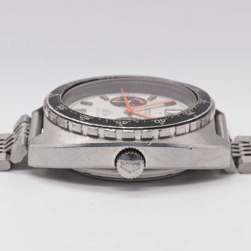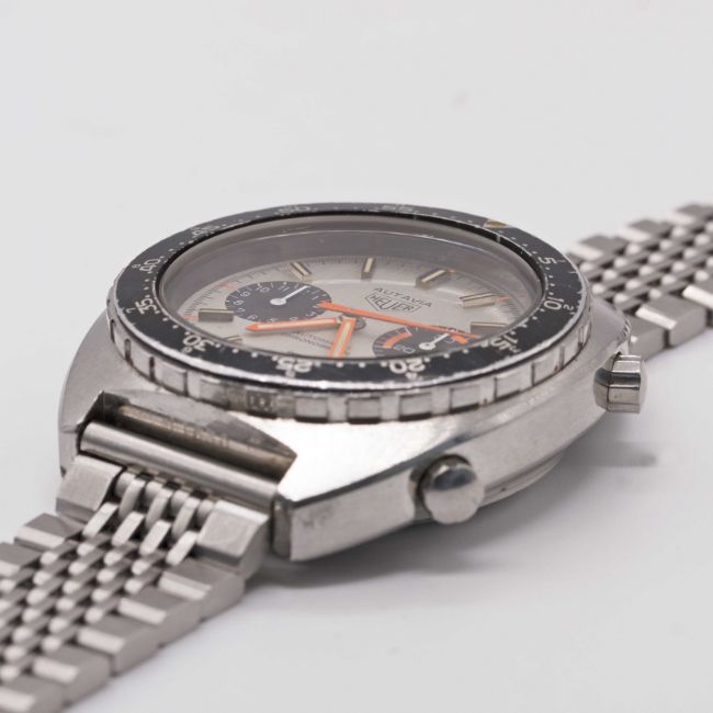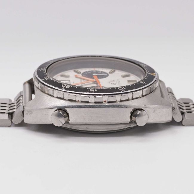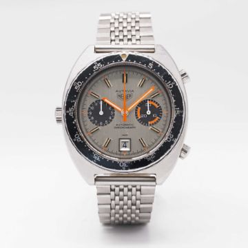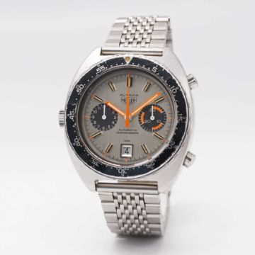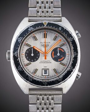 A GENTLEMAN'S STAINLESS STEEL HEUER AUTAVIA AUTOMATIC CHRONOGRAPH BRACELET WATCHCIRCA 1970s, REF. 11630 "ORANGE BOY" WITH BRUSHED SILVER DIALMovement: 17J, automatic, cal. 12, signed Heuer.Case: Width approx. 42mm, screw back, signed Heuer-Leonidas SA, numbered 26x,xxx, rotating MH bezel, Heuer crown & pushers.Bracelet: Unsigned "BoR" bracelet.CONDITION REPORTDial: Original dial in excellent condition.Movement: Running & functioning at present, timekeeping and accuracy cannot be guaranteed.Case: In very good condition, with some small scratches & light wear due to general use.Strap/Bracelet: In very good condition, with some light scratches due to general use.