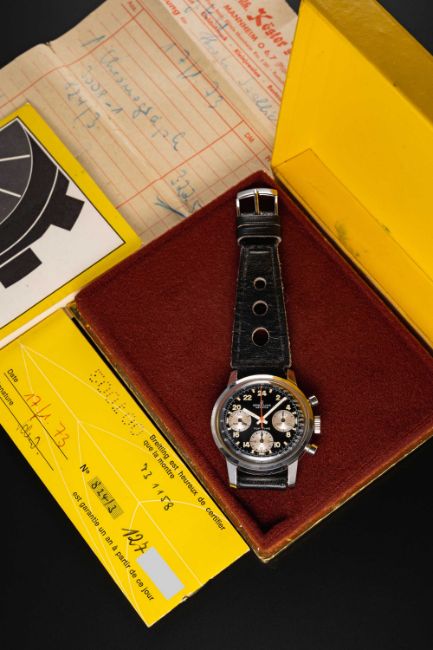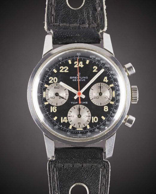 A RARE GENTLEMAN'S STAINLESS STEEL BREITLING TOP TIME 24 HOUR CHRONOGRAPH WRIST WATCHDATED 1973, REF. 824 WITH "REVERSE PANDA" DIAL, ACCOMPANIED BY THE ORIGINAL GUARANTEE, INSTRUCTION BOOKLET & PURCHASE RECEIPT Movement: 17J, manual wind, Venus cal. 178, signed Breitling Watch Ltd.Case: Diameter approx. 38mm, snap back, signed Breitling, numbered 1,2xx,xxx, Breitling crown.Strap: Perforated leather.CONDITION REPORTDial: Original dial in excellent condition.Movement: Running & functioning at present, timekeeping and accuracy cannot be guaranteed.Case: In excellent condition, with some light scratches due to general use.Strap/Bracelet: In excellent condition.