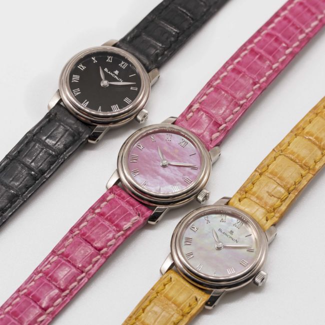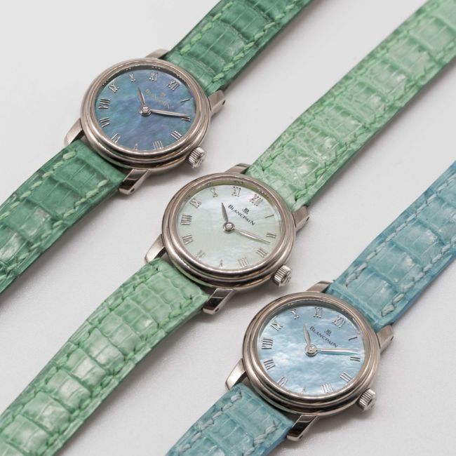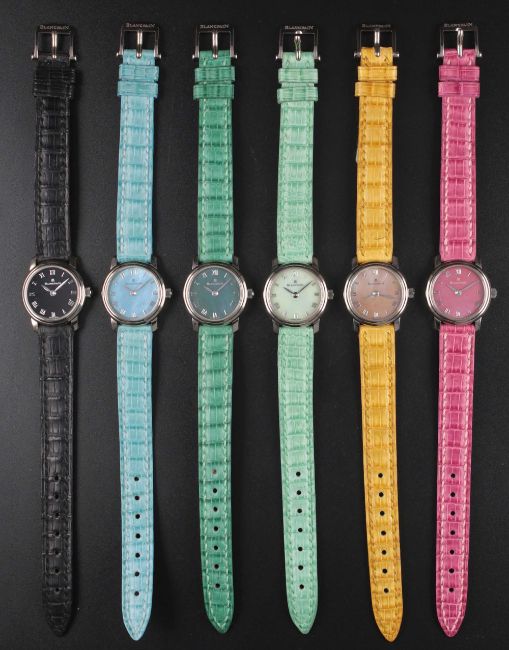 A SET OF SIX LADIES "NOS" 18K SOLID WHITE GOLD BLANCPAIN LADYBIRD WRIST WATCHESCIRCA 1990s, SIX WATCHES FROM A SET OF TEN (SET NO. 1) WITH VARIOUS COLOURED DIALS & CORRESPONDING STRAPSMovements: Manual wind, signed Blancpain.Cases: Diameter approx. 21mm, exhibition back, signed Blancpain Ladybird, 18k hallmarks, individually numbered x/10, original crown.Straps: Original Blancpain leather strap & 18k solid white gold pin buckle.CONDITION REPORTDials: Original dials in excellent condition.Movements: Running & functioning at present, timekeeping and accuracy cannot be guaranteed.Cases: In excellent condition.Straps/Bracelets: In excellent condition.