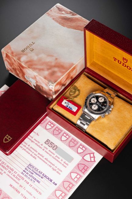 A GENTLEMAN'S STAINLESS STEEL ROLEX TUDOR OYSTERDATE AUTOMATIC CHRONO TIME "BIG BLOCK" CHRONOGRAPH BRACELET WATCHCIRCA 1993, REF. 79180 WITH "REVERSE PANDA" DIAL, ACCOMPANIED BY THE ORIGINAL BOX (WITH REFERENCE STICKER), GUARANTEE, STOCK TAG & CASE BACK STICKER ON WALLETMovement: 17J, automatic, cal. 7750, signed Tudor Automatic-Prince.Case: Diameter approx. 40mm, Oyster case, signed Montres Tudor S.A., numbered B50x,xxx, steel units per hour bezel, Rolex triplock crown & screw-down pushers.Bracelet: Original Tudor Oyster bracelet, numbered R11/78360/589.CONDITION REPORTDial: Original dial in excellent condition.Movement: Running & functioning at present, timekeeping and accuracy cannot be guaranteed.Case: In good condition, with some scratches due to general use.Strap/Bracelet: In excellent condition, with light scratches due to general use.