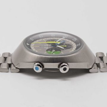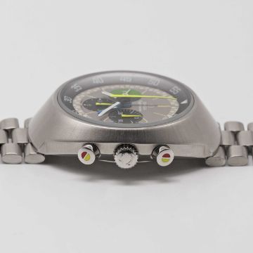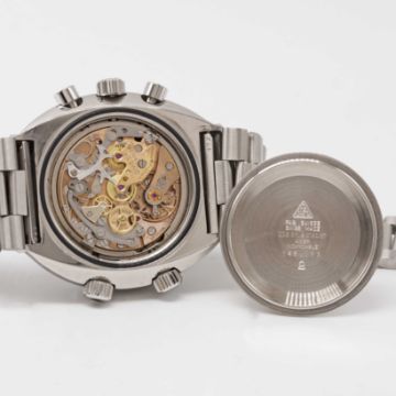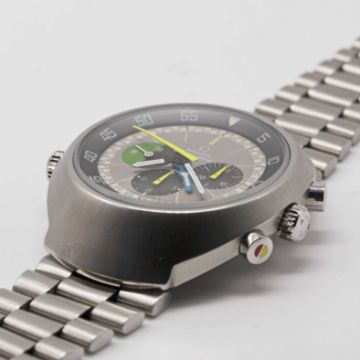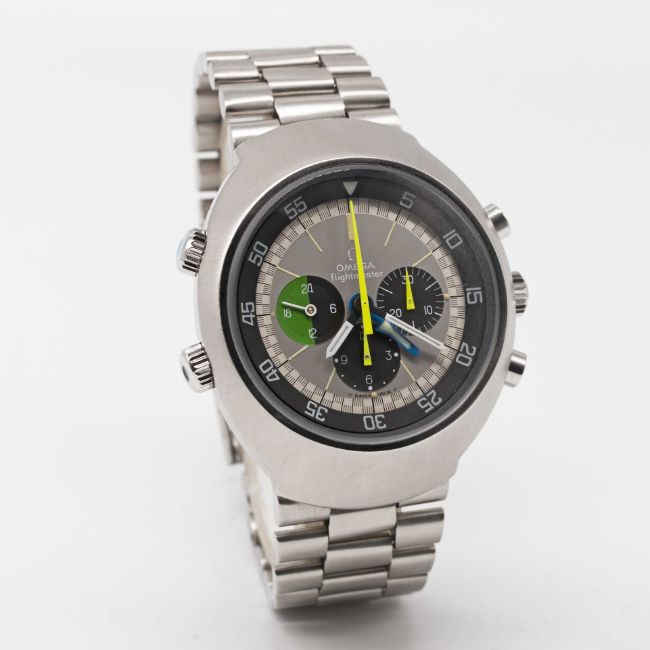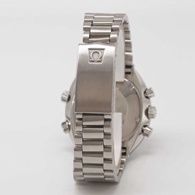 A GENTLEMAN'S STAINLESS STEEL OMEGA FLIGHTMASTER CHRONOGRAPH BRACELET WATCHCIRCA 1970, REF. 145.013 1ST GENERATION WITH RARE "GHOST" DIAL Movement: 17J, manual wind, cal. 910, signed Omega, numbered 29,xxx,xxx. Case: Diameter approx. 43mm, screw back, Flightmaster emblem engraved on case back, signed Omega Watch Co., Omega crowns & pushers.Bracelet: Original Omega bracelet, numbered (11) 1162/172.CONDITION REPORTDial: Original dial in excellent condition.Movement: Running & functioning at present, timekeeping and accuracy cannot be guaranteed.Case: In very good condition.Strap/Bracelet: In good condition.