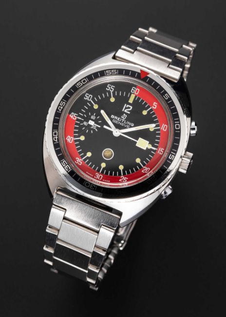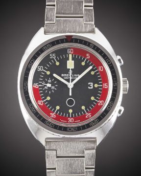 A RARE GENTLEMAN'S "NOS" STAINLESS STEEL BREITLING REFEREE "SOCCER TIMER" CHRONOGRAPH BRACELET WATCHCIRCA 1973, REF. 34-31 BLACK DIAL WITH RED 45 MINUTE INDICATOR FOR TIMING HALVES OF FOOTBALL MATCHES, WITH "SLOW MOVING" MINUTE CHRONOGRAPH HANDMovement: 17J, manual wind, Valjoux cal. 7731, signed Breitling Watch Ltd.Case: Width approx. 41mm, snap back, signed Breitling Watch Ltd, numbered 1,4xx,xxx, patent number, 60 minute rotating bezel, Breitling crown.Bracelet: Original Breitling bracelet.CONDITION REPORTDial: Original dial in excellent condition.Movement: Running & functioning at present, timekeeping and accuracy cannot be guaranteed.Case: In excellent condition.Strap/Bracelet: In excellent condition.The watch looks to be in "NOS" condition.
