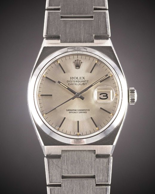 A GENTLEMAN'S STAINLESS STEEL ROLEX OYSTERQUARTZ DATEJUST BRACELET WATCHCIRCA 1979, REF. 17000 WITH SILVER DIALMovement: 11J, quartz chronometer, quick-set date, cal. 5035, signed Rolex S.A., numbered.Case: Diameter approx. 36mm, Oyster case, signed Montres Rolex S.A., numbered 6,0xx,xxx, smooth bezel, sapphire crystal, Rolex crown.Bracelet: Rolex Oysterquartz bracelet, numbered 17000 B.CONDITION REPORTDial: Original dial in excellent condition.Movement: Running & functioning at present, timekeeping and accuracy cannot be guaranteed.Case: In very good condition, with some small scratches due to general use.Strap/Bracelet: In very good condition, with some light scratches & wear due to general use.