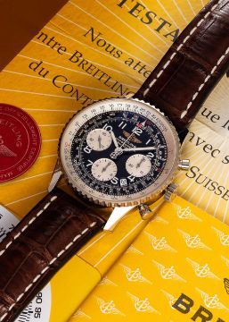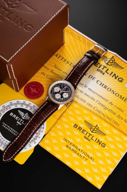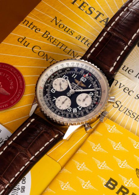 A GENTLEMAN'S 18K SOLID WHITE GOLD BREITLING CHRONOMETRE NAVITIMER CHRONOGRAPH WRIST WATCHDATED 2006, REF. J23322 WITH ORIGINAL BOX, GUARANTEE, CHRONOMETER CERTIFICATE & BOOKLETSMovement: 27J, automatic chronometer, signed Breitling.Case: Diameter approx. 42mm, screw back, signed Breitling, numbered 01x / 2,0xx,xxx, 18k hallmarks, Breitling crown.Strap: Original Breitling leather strap & 18k solid white gold pin buckle.CONDITION REPORTDial: Original dial in excellent condition.Movement: Running & functioning at present, timekeeping and accuracy cannot be guaranteed.Case: In excellent condition, with some light scratches due to general use.Strap/Bracelet: In good condition.