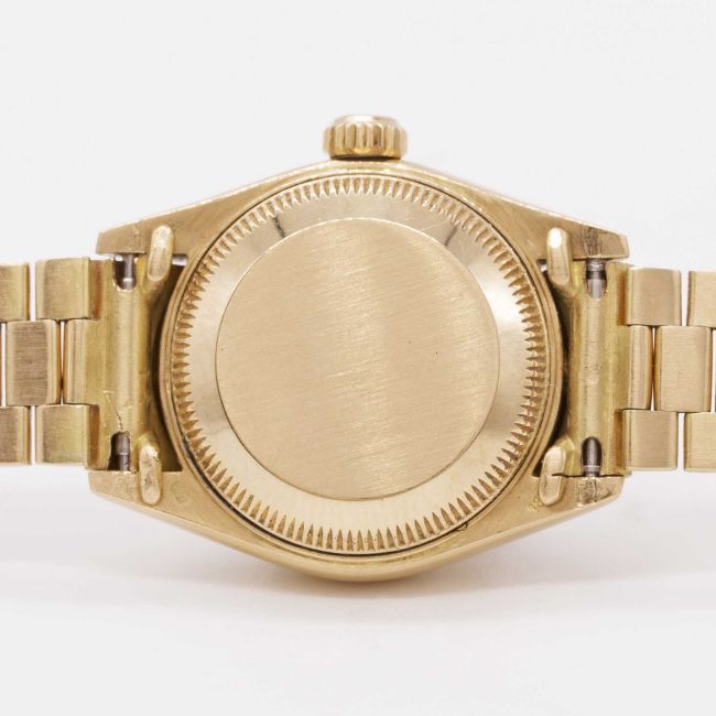 Case: Diameter approx. 26mm, Oyster case, signed Montres Rolex S.A., numbered 9,0xx,xxx, 18k hallmarks, solid gold fluted bezel, sapphire crystal, Rolex crown.