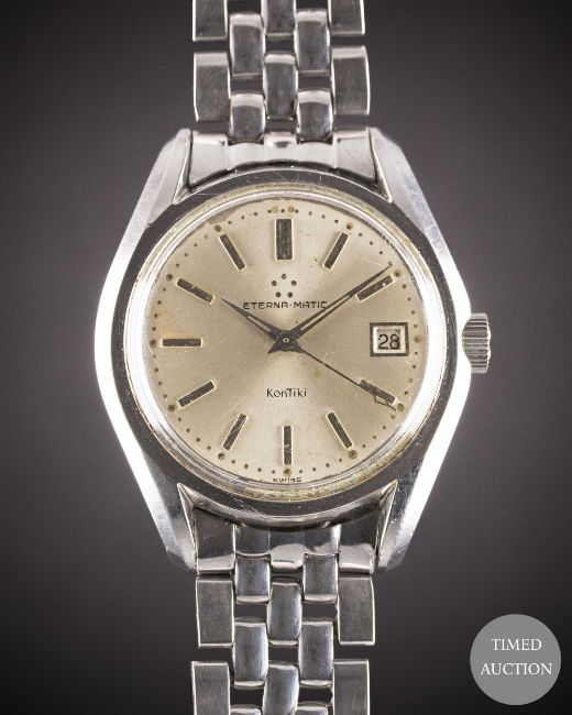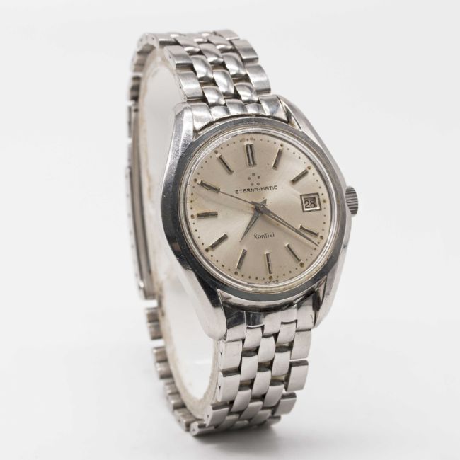 Case: Diameter approx. 37mm, screw back, gold Kontiki emblem embossed on case back, signed Eterna Watch Co, Eterna-Matic crown.