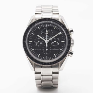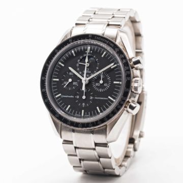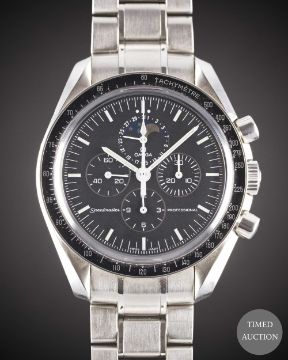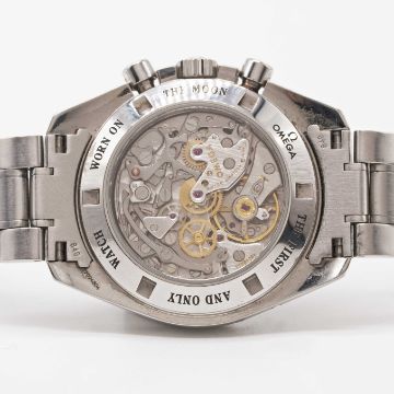 Case: Diameter approx. 42mm, screw back, sapphire exhibition back with engraving to edge 'The First And Only Watch Worn On The Moon', signed Omega, numbered 77,xxx,xxx, tachymetre bezel, Omega crown.
