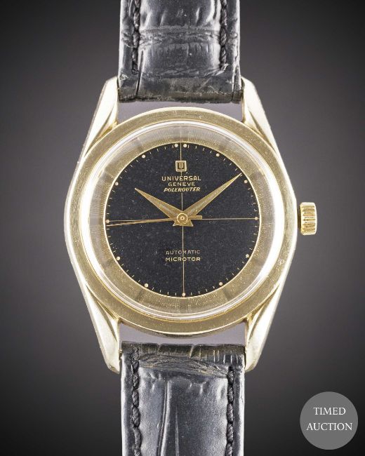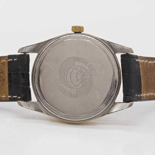 Case: Diameter approx. 35mm, "lyre" lugs, steel screw back, signed Universal Geneve with Polerouter emblem embossed on case back, maker's mark HF, no number.