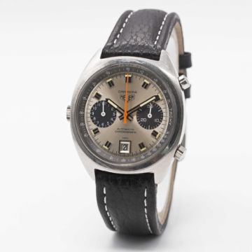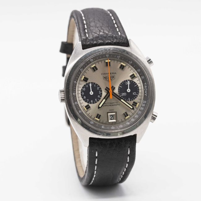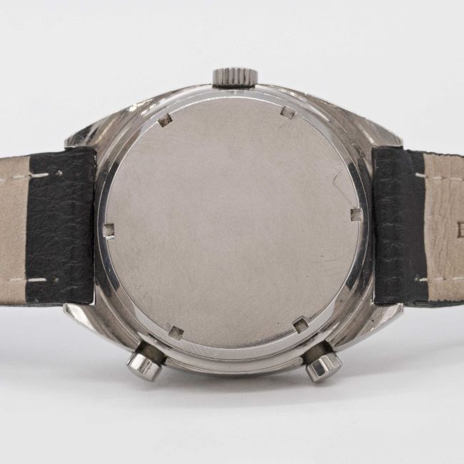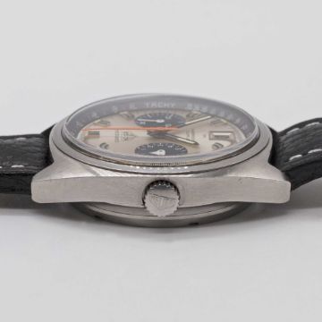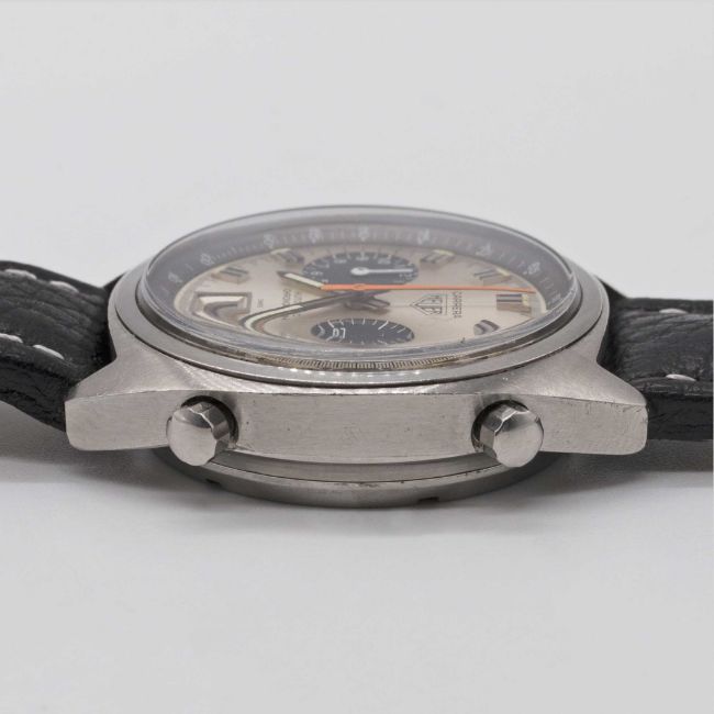 Case: Width approx. 38mm, screw back, signed Heuer-Leonidas SA, numbered 19x,xxx, Heuer crown & pushers.