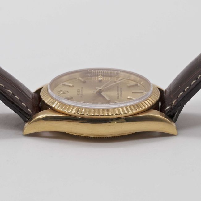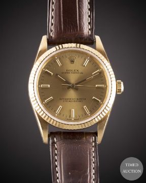Case: Diameter approx. 34mm, Oyster case, signed Montres Rolex S.A., 18k hallmarks, N serial no., sapphire crystal, Rolex crown.