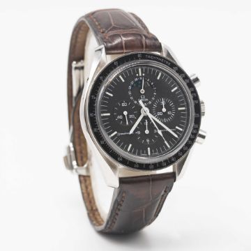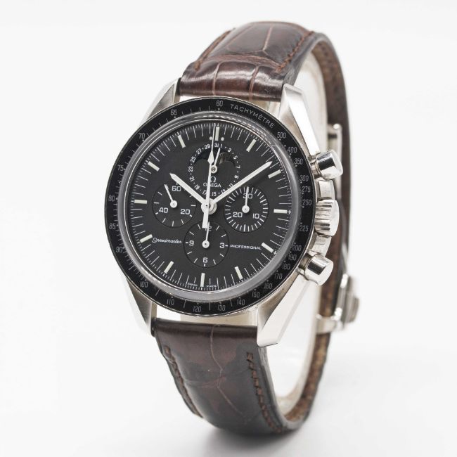 Case: Diameter approx. 42mm, screw back, sapphire exhibition back with engraving to edge 'The First And Only Watch Worn On The Moon', signed Omega, numbered 77,xxx,xxx, tachymetre bezel, Omega crown.