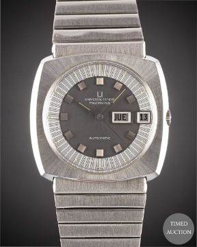 A GENTLEMAN'S STAINLESS STEEL UNIVERSAL GENEVE POLEROUTER AUTOMATIC BRACELET WATCH