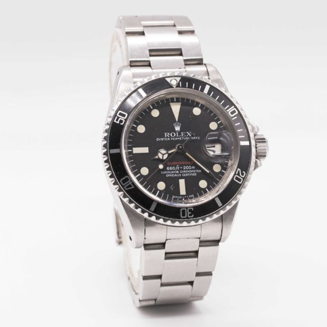 A RARE GENTLEMAN'S STAINLESS STEEL ROLEX OYSTER PERPETUAL DATE "RED WRITING" SUBMARINER BRACELET WATCHCIRCA 1972, REF. 1680 "SINGLE RED" WITH MARK V DIALMovement: 26J, automatic chronometer, cal. 1570, signed Montres Rolex S.A., numbered.Case: Diameter approx. 40mm, Oyster case, signed Montres Rolex S.A., dated III.71, numbered 3,1xx,xxx, 60 minute rotating bezel, Rolex triplock crown.Bracelet: Rolex Oyster Submariner bracelet, numbered MA11/91350/501B.CONDITION REPORTDial: Original dial in excellent condition, with some very small signs of age.Movement: Working at present.Case: In excellent condition, with some small scratches due to general use.Strap/Bracelet: In excellent condition, with some light scratches due to general use.