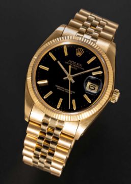 A FINE GENTLEMAN'S SIZE 18K SOLID YELLOW GOLD ROLEX OYSTER PERPETUAL DATE BRACELET WATCHCIRCA 1979, REF. 1503 WITH GLOSS BLACK DIALMovement: 26J, automatic chronometer, cal. 1570, signed Montres Rolex S.A., numbered.Case: Diameter approx. 34.5mm, Oyster case, signed Montres Rolex S.A., numbered 5,9xx,xxx, 18k hallmarks, fluted bezel, Rolex crown.Bracelet: Original Rolex Jubilee 18k solid gold bracelet, end links numbered 56.CONDITION REPORTDial: Original dial in excellent condition.Movement: Running & functioning at present, timekeeping and accuracy cannot be guaranteed.Case: In excellent condition, with some light scratches due to general use.Strap/Bracelet: In excellent condition.