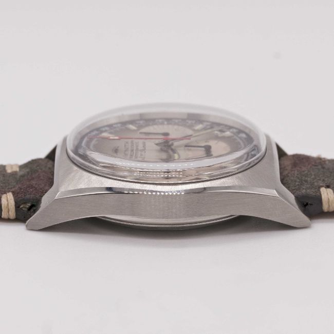A GENTLEMAN'S STAINLESS STEEL ZENITH EL PRIMERO AUTOMATIC CHRONOGRAPH WRIST WATCHCIRCA 1970, REF. A385 WITH "FUME" DIALMovement: 31J, automatic, cal. 3019 PHC, signed Zenith.Case: Width approx. 37mm, screw back, emblem embossed on case back, numbered (faint), Zenith crown.Strap: Camo suede.CONDITION REPORTDial: Original dial in very good condition, registers showing signs of age.Movement: Running & functioning at present, timekeeping and accuracy cannot be guaranteed.Case: In very good condition.Strap/Bracelet: In excellent condition.