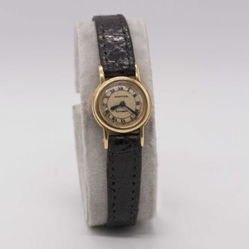 A RARE LADIES 18K SOLID GOLD CARTIER LONDON BACKWIND WRIST WATCHCIRCA 1961, WITH LONDON HALLMARKS Movement: Manual wind, signed Jaeger-LeCoultre, numbered 1,6xx,xxx, marked Fab. Suisse.Case: Diameter approx. 17mm, backwind, marked JC, 18k London hallmarks with date letter (f), numbered 63xx / •92xx• to case back.Strap: Leather.  CONDITION REPORTDial: Original dial in fair condition, with some damage, particularly to left side between 8 & 10 o'clock.Movement: Running & functioning at present, timekeeping and accuracy cannot be guaranteed.Case: In good condition, with light scratches due to general use.Strap/Bracelet: In excellent condition.