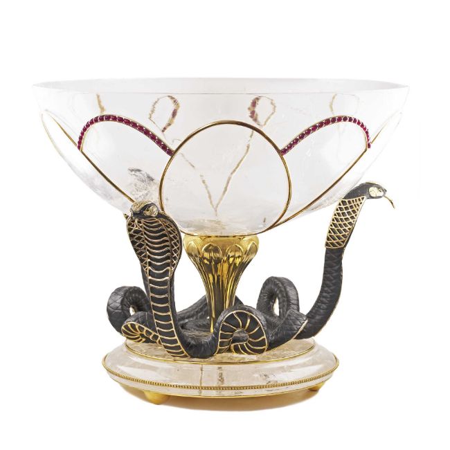 A FINE, RARE & IMPRESSIVE SILVER GILT, GOLD & ROCK CRYSTAL OBJET D'ARTCIRCA 1980s, "COBRA BOWL" WITH ORIGINAL FITTED BOXA rock crystal bowl with gold and ruby set mounts marked 750, sat above three bronze, gold & diamond set cobra figures. Rock crystal base with with 925 silver gilt and 750 gold marks and maker's marks.Measures approx. 31cm in height, bowl approx. 37cm in diameter, base approx. 24.5mm in diameter.Total weight is approx 9.7kg.CONDITION REPORTIn very good condition. Please note that the rock crystal bowl is showing flaws (Please see additional pictures)