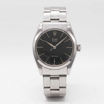 A RARE GENTLEMAN'S STAINLESS STEEL ROLEX OYSTER ROYAL PRECISION BRACELET WATCHCIRCA 1962, REF. 6426 WITH GLOSS BLACK GILT DIAL & "DAGGER" HANDSMovement: 17J, manual wind, cal. 1210, signed Montres Rolex S.A, numbered.Case: Diameter approx. 34.5mm, Oyster case, signed Montres Rolex S.A, dated I.62, numbered 78x,xxx, Rolex crown.Bracelet: Original Rolex Oyster riveted bracelet, end links numbered 60, dated 3.62.CONDITION REPORTDial: Original dial in excellent condition, showing some small signs of age.Movement: Running & functioning at present, timekeeping and accuracy cannot be guaranteed.Case: In excellent condition, with some light scratches due to general use.Strap/Bracelet: In very good condition, with some light scratches due to general use.