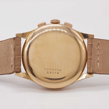 A RARE GENTLEMAN'S LARGE SIZE 18K SOLID ROSE GOLD UNIVERSAL GENEVE TRI COMPAX MOONPHASE TRIPLE CALENDAR CHRONOGRAPH WRIST WATCHCIRCA 1950, REF. 12296Movement: 17J, manual wind, cal. 481, signed Universal Geneve.Case: Diameter approx. 38mm, snap back, signed Universal Geneve, numbered, 18k hallmarks.Strap: Leather.CONDITION REPORTDial: Original dial in good condition, showing signs of age & patina.Movement: Running & functioning at present, timekeeping and accuracy cannot be guaranteed.Case: In excellent condition, with some light scratches due to general use.Strap/Bracelet: In excellent condition.