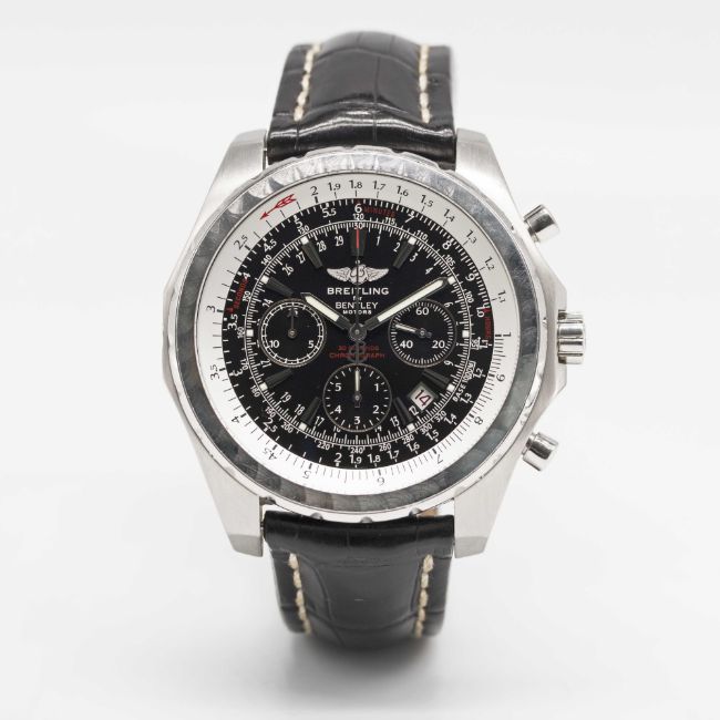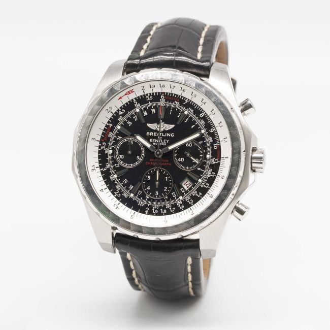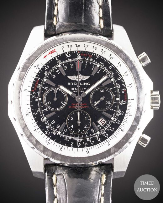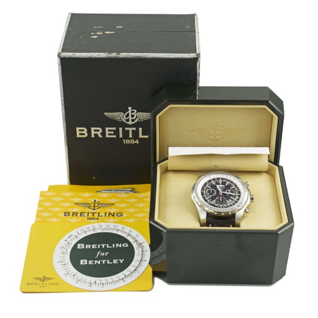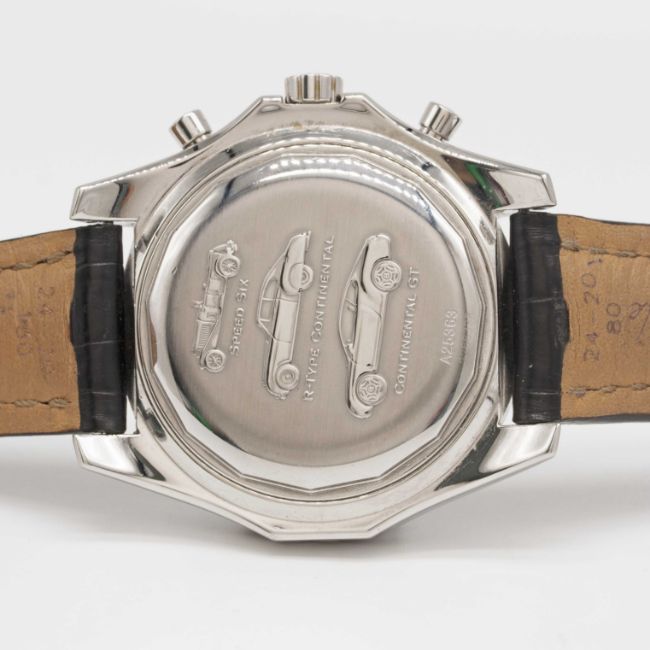 Case: Diameter approx. 48.8mm, screw back case embossed with three pictures of Bentley motor cars, signed Breitling, numbered 2,26x,xxx, Breitling crown & pushers.
