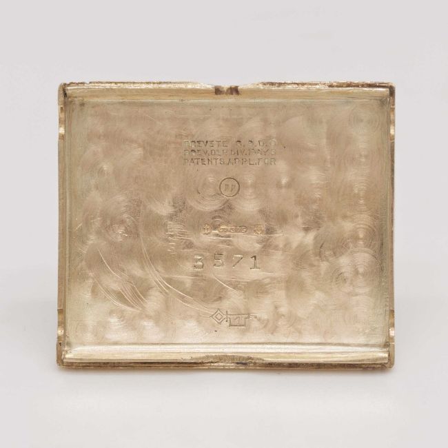 Case: Approx. 38mm by 23mm, MG initials inscribed on reverse side in Art Deco style, 9ct hallmarks, Brevete S.G.D.G. patent marks, marked GS, numbered 3,5xx.