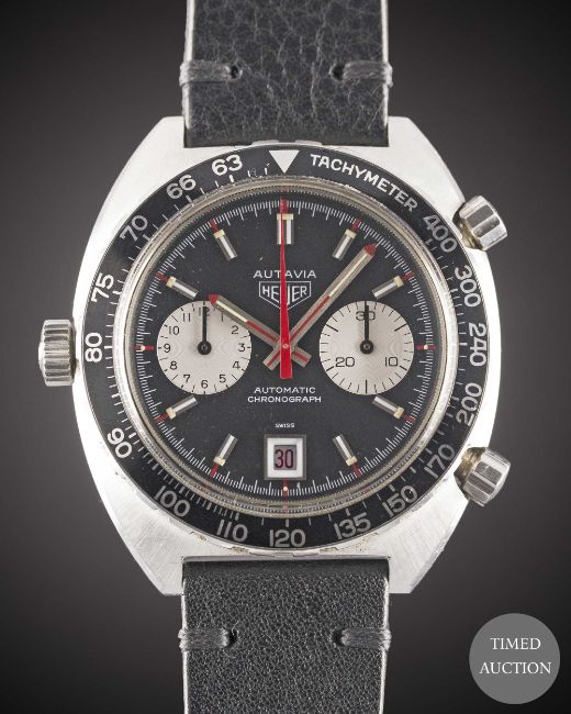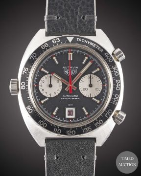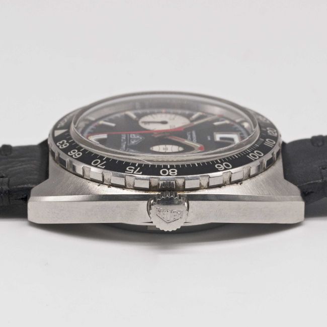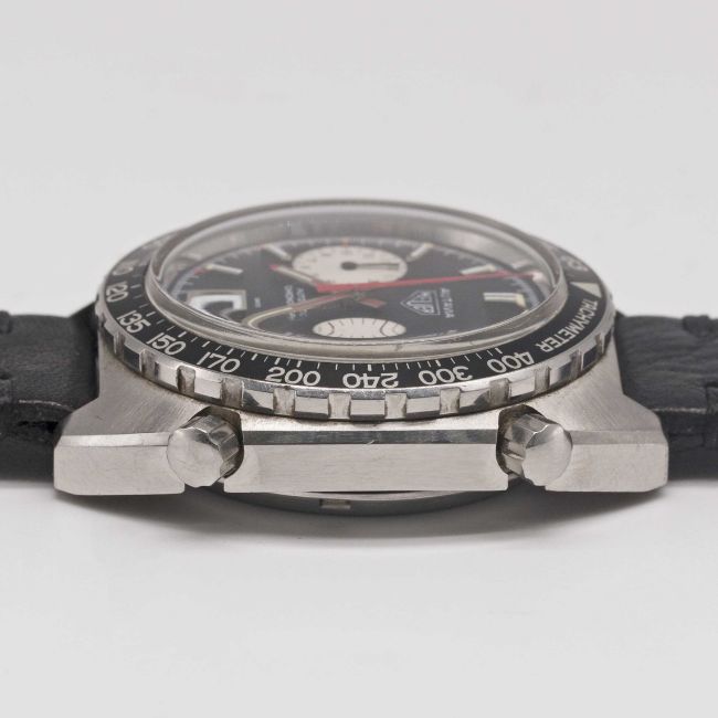 Case: Width approx. 42mm, screw back, signed Heuer-Leonidas SA, numbered 27x,xxx, rotating tachymetre bezel, Heuer crown & pushers.