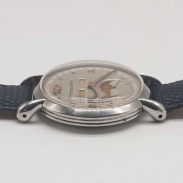 Case: Diameter approx. 36mm, "teardrop" lugs, signed LeCoultre Co, numbered 34x,xxx.