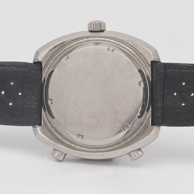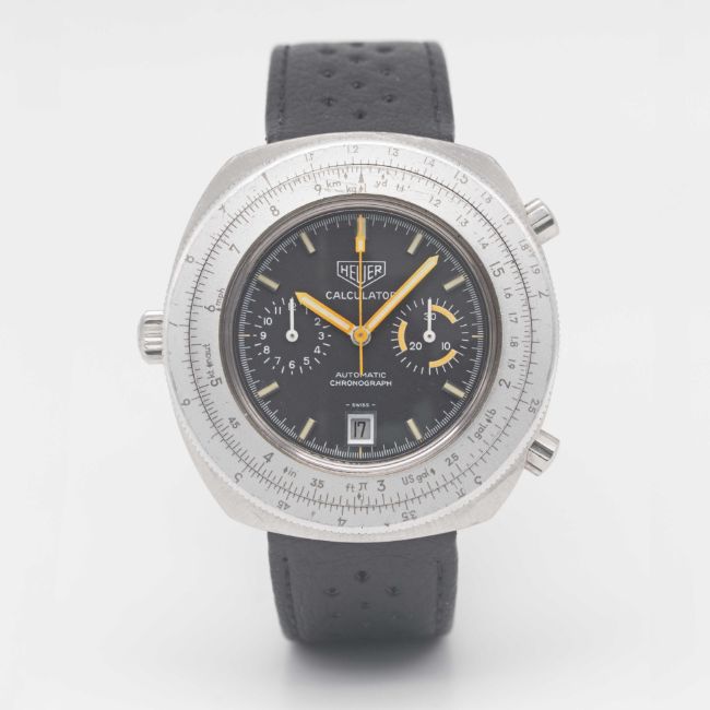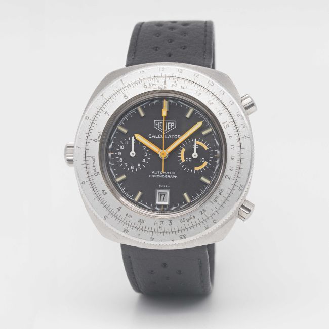 Case: Width approx. 46mm, screw back, signed Heuer-Leonidas SA, rotating "calculator" bezel, Heuer crown & pushers.