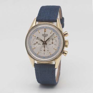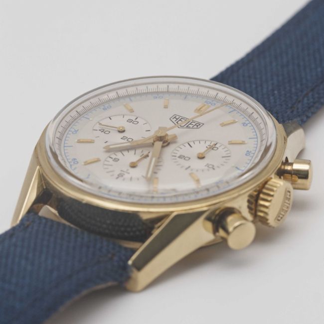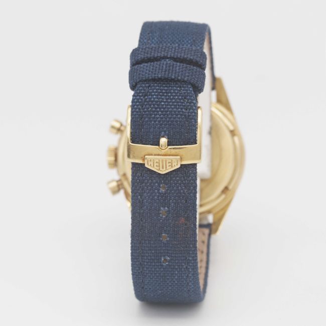 Strap: Textile strap with original 18k solid gold Heuer re-edition pin buckle.