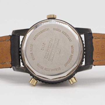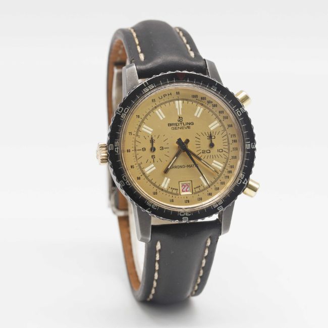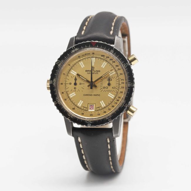 A RARE GENTLEMAN'S ORIGINAL PVD COATED BREITLING CHRONO-MATIC CHRONOGRAPH WRIST WATCHCIRCA 1970s, REF. 2110 WITH BRUSHED GOLD COLOURED DIAL & GOLD CAPPED CROWN & PUSHERS Movement: 17J, automatic, cal. 112, signed Breitling.Case: Diameter approx. 40mm, screw back, signed Breitling, numbered 1,3xx,xxx, MH rotating bezel, gold capped Breitling crown & pushers.Strap: Breitling leather strap & deployment clasp.CONDITION REPORTDial: Original dial in excellent condition, showing some small signs of age.Movement: Running & functioning at present, timekeeping and accuracy cannot be guaranteed.Case: In very good condition, with signs of light wear to PVD, light scratches & due to general use.Strap/Bracelet: In good condition.