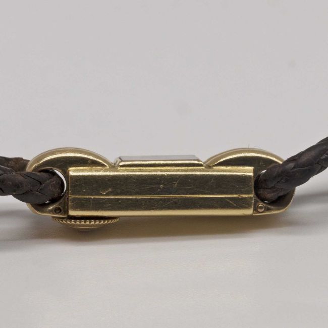 A RARE LADIES 18K SOLID GOLD CARTIER BACK WIND WRIST WATCHCIRCA 1929, WITH LONDON IMPORT MARK, THE SMALLEST EWC BACK WIND MOVEMENT PRODUCED FOR CARTIERMovement: 17J, manual wind, signed European Watch & Clock Co.Case: Approx. 25mm by 7.3mm, maker's mark JC, 18/750 London import marks with letter O, two sets of numbers.Strap: Cartier leather strap with original Cartier 18k gold deployment clasp.CONDITION REPORTDial: Original dial in good condition, showing some small signs of age.Movement: Running & functioning at present, timekeeping and accuracy cannot be guaranteed.Case: In good condition, with some light wear & scratches due to general use.Strap/Bracelet: In good condition.