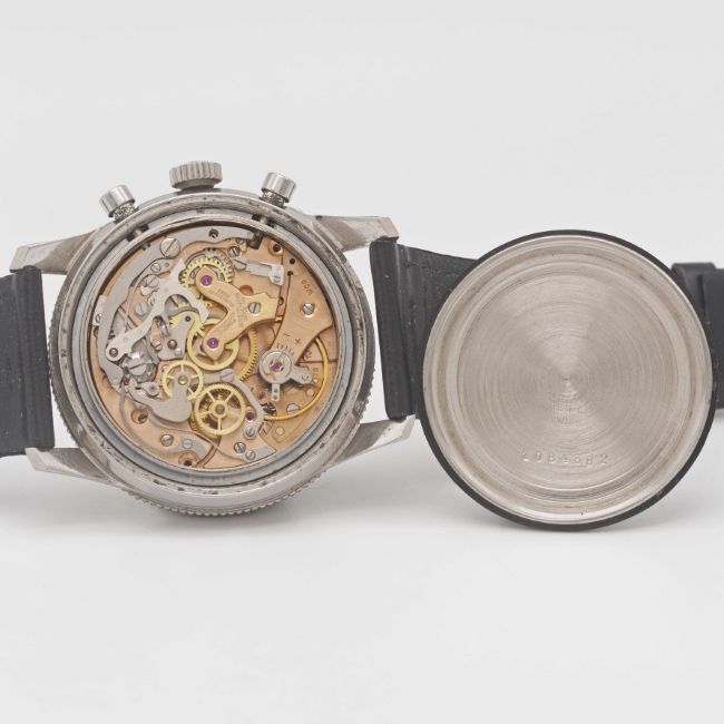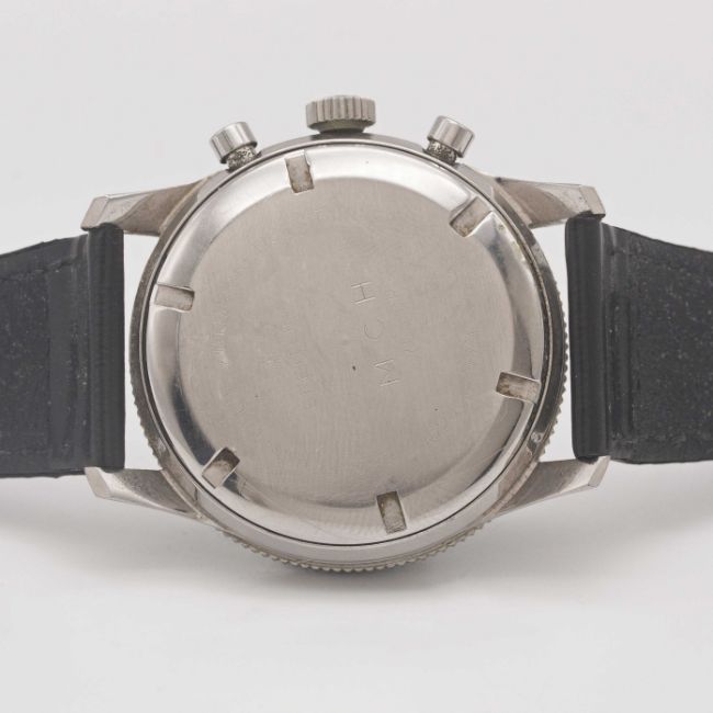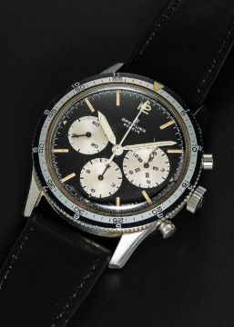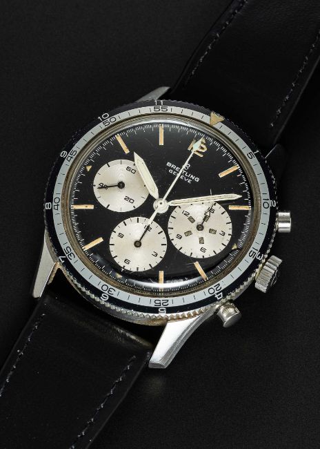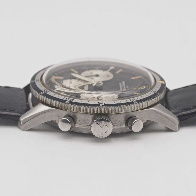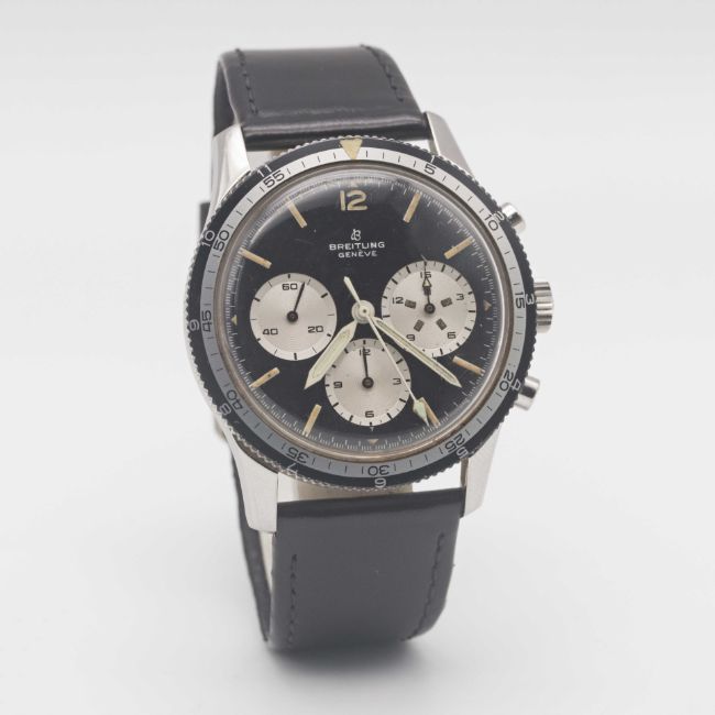 A RARE GENTLEMAN'S STAINLESS STEEL BREITLING 765 CO PILOT CHRONOGRAPH WRIST WATCHCIRCA 1966, REF. 765 CPMovement: 17J, manual wind, Venus cal. 178, signed Breitling Watch Ltd.Case: Diameter approx. 41mm, screw back, signed Breitling Watch Ltd, initials MCH inscribed on case back, numbered 1,0xx,xxx, rotating MH bezel, Breitling crown.Strap: Leather.CONDITION REPORTDial: Original dial in excellent condition, showing some very small signs of age.Movement: Running & functioning at present, timekeeping and accuracy cannot be guaranteed.Case: In very good condition, with some light scratches due to general use, bezel is excellent.Strap/Bracelet: In fair condition.