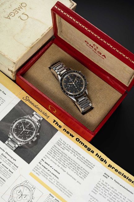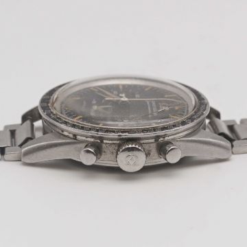 A RARE GENTLEMAN'S STAINLESS STEEL OMEGA SPEEDMASTER CHRONOGRAPH BRACELET WATCHCIRCA 1961, REF. 2998-4 WITH "ALPHA" HANDS, ACCOMPANIED BY THE ORIGINAL OMEGA CORDUROY BOX & INSTRUCTION PAMPHLETMovement: 17J, manual wind, cal. 321, signed Omega Watch Co., numbered 17,7xx,xxx.Case: Diameter approx. 40mm, screw back, signed Omega Watch Co, Speedmaster emblem on case back, dust cover, "DON" tachymetre bezel, original Omega "Naiad" crown.Bracelet: Original Omega flat link bracelet, dated 2/61, missing end links.CONDITION REPORTDial: Original dial in excellent condition.Movement: Running & functioning at present, timekeeping and accuracy cannot be guaranteed.Case: In good condition, with small scratches due to general use, bezel fairly worn, cracks in the original plexiglass.Strap/Bracelet: In fair condition, light scratches & wear due to general use, former owner's name marked on the inside of clasp, missing end links.