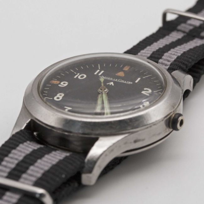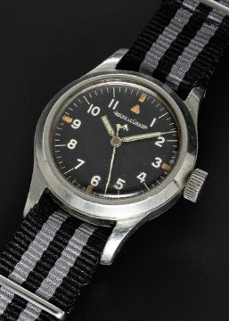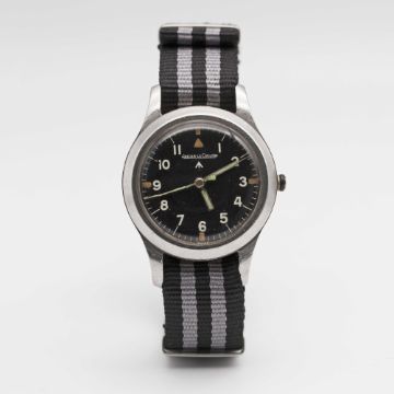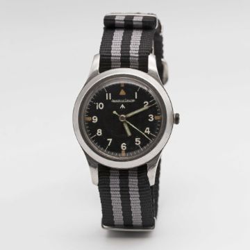 A RARE GENTLEMAN'S STAINLESS STEEL BRITISH MILITARY JAEGER LECOULTRE MARK 11 RAF PILOTS WRIST WATCHDATED 1948Movement: Manual wind, hacking seconds, cal. 488/Sbr, signed Jaeger-LeCoultre with military arrow, numbered 59x,xxx.Case: Diameter approx. 35mm, fixed bars, screw back, signed LeCoultre Co, issue markings ^ 6B/346 2367/48, anti-magnetic dust cover.Strap: NATO.CONDITION REPORTDial: Original dial in good condition, showing some signs of age.Movement: Running & functioning at present, crown has come away from winding stem and will be supplied with the watch, timekeeping and accuracy cannot be guaranteed.Case: In very good condition, with small scratches due to use.Strap/Bracelet: In excellent condition.