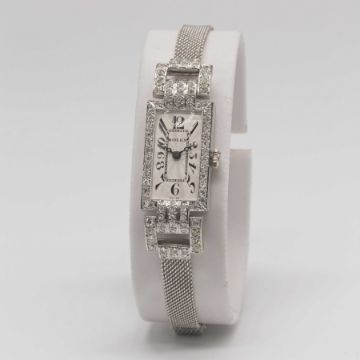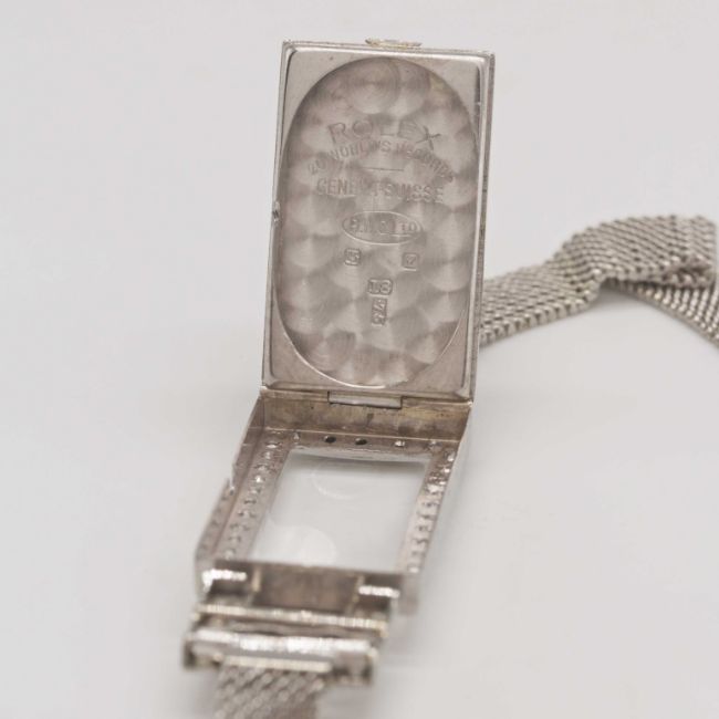 A FINE LADIES SOLID WHITE GOLD & DIAMOND ROLEX COCKTAIL BRACELET WATCHCIRCA 1930s, REF. 760 WITH GUILLOCHE DIAL Movement: 15J, manual wind, signed Rolex Prima.Case: Approx. 15mm by 46mm (lug to lug), 18k solid gold hinged case, ornate swivel lugs, original diamond set, period engraved sides, signed Rolex 20 World's Records, marked R.W.C. Ltd, 18k hallmarks, numbered 49,xxx, Rolex Patent crown.Bracelet: 9ct solid white gold bracelet, signed Premo.CONDITION REPORTDial: Refinished dial in excellent condition.Movement: Running & functioning at present, timekeeping and accuracy cannot be guaranteed.Case: In excellent condition.Strap/Bracelet: In excellent condition.