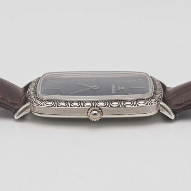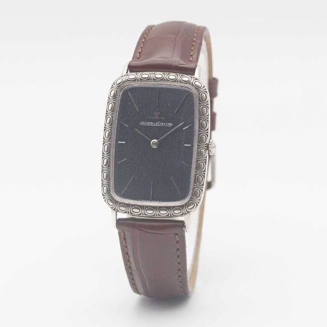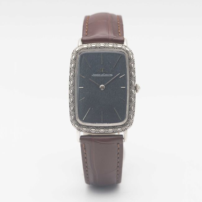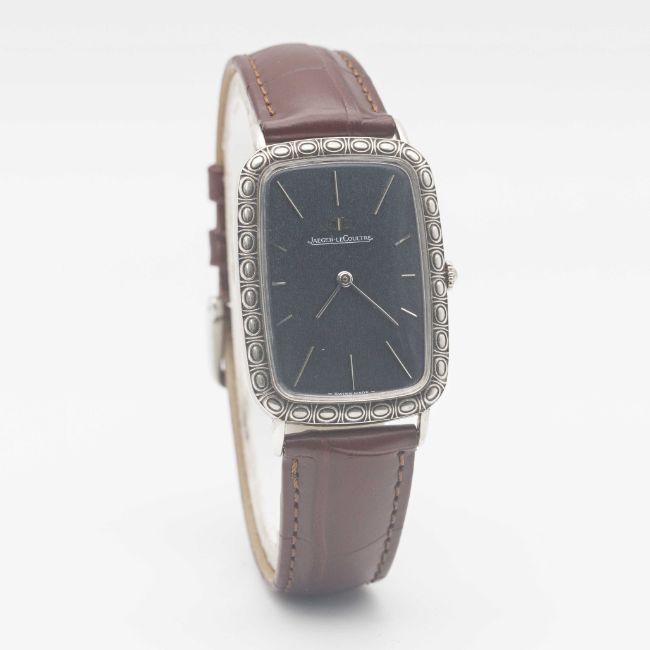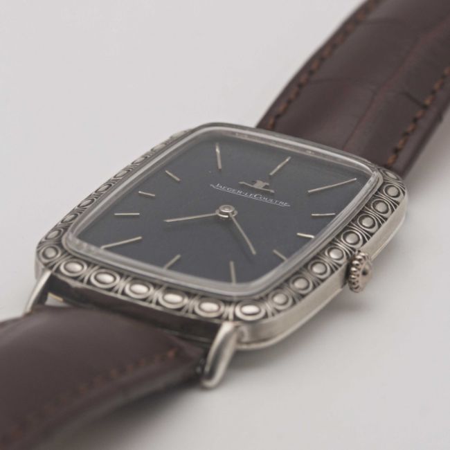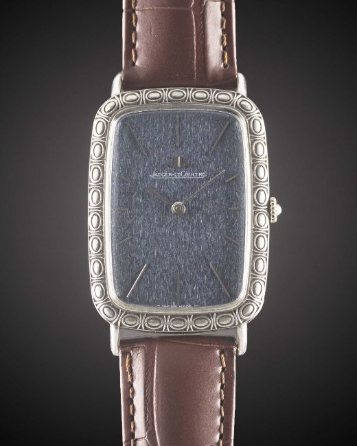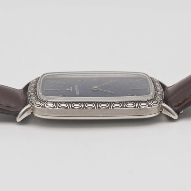 A GENTLEMAN'S SIZE SOLID SILVER JAEGER LECOULTRE RECTANGULAR WRIST WATCHCIRCA 1970s, REF. 9037 WITH BLUE TEXTURED DIALMovement: 17J, manual wind, cal. 818/2, signed Jaeger-LeCoultre, numbered 2,0xx,xxx.Case: Approx. 39mm by 28mm, original engraved pattern, signed LeCoultre Co, maker's mark PHC, silver hallmarks, numbered 12xx xxx.Strap: Leather.CONDITION REPORTDial: Original dial in excellent condition, showing some small signs of age.Movement: Running & functioning at present, timekeeping and accuracy cannot be guaranteed.Case: In excellent condition, with some light scratches due to occasional use.Strap/Bracelet: In excellent condition.