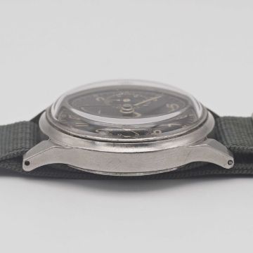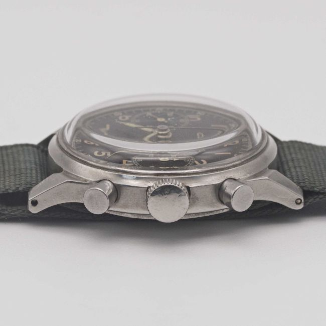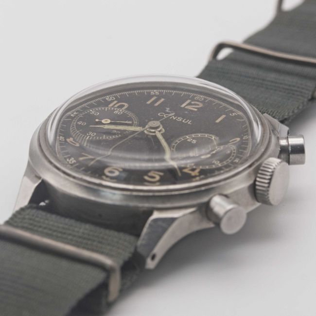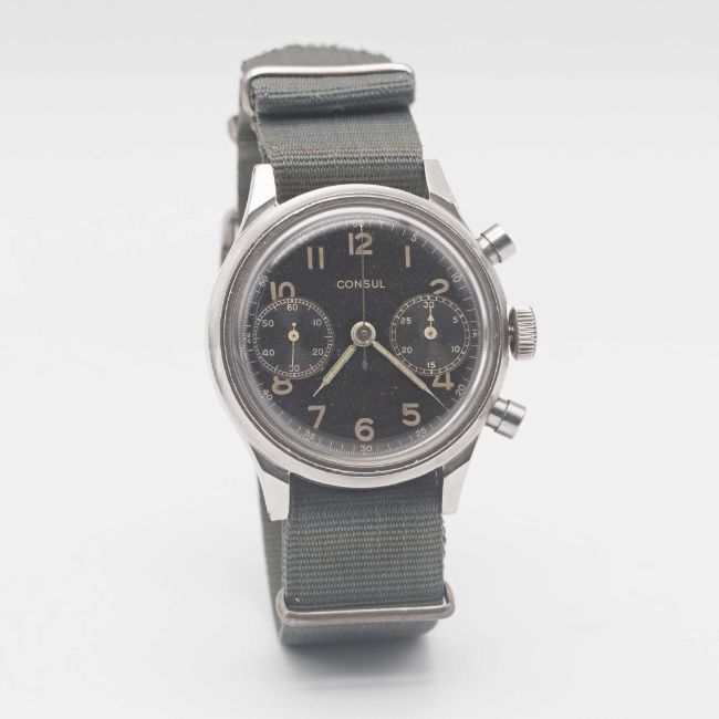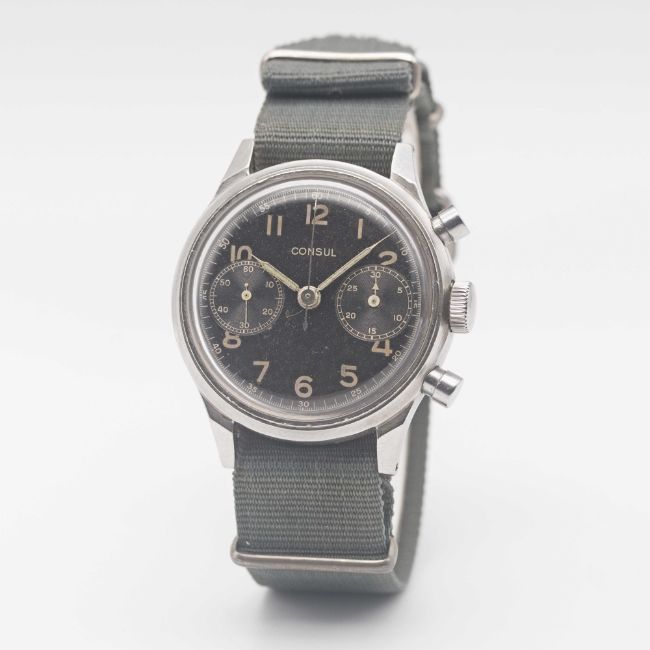 A GENTLEMAN'S LARGE SIZE STAINLESS STEEL CONSUL ANTIMAGNETIC WATERPROOF CHRONOGRAPH WRIST WATCHCIRCA 1940s, WITH SPILLMAN CASE & GLOSS BLACK DIALMovement: 17J, manual wind, cal. 141, Valjoux base cal. 22, signed Consul. Case: Diameter approx. 38mm, screw back, numbered, faceted lugs.Strap: NATO.CONDITION REPORTDial: Original dial in very good condition, showing a slight "tropical" patina.Movement: Working at present.Case: In very good condition, with light scratches due to general use.Strap/Bracelet: In fair condition.